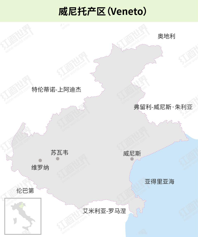 威尼托(Veneto)位于意大利的東北部,以世界知名“水城”——威尼斯(Venice)為首府,坐擁被聯合國教科文組織(UNESCO)納為世界文化遺產的維羅納(Verona),充滿藝術和文化的氣息。與此同時,威尼托還是意大利舉足輕重的葡萄酒產區,不僅擁有悠久的釀酒歷史,其獨具一格的釀酒工藝和多樣化的葡萄酒風格也令人印象深刻。