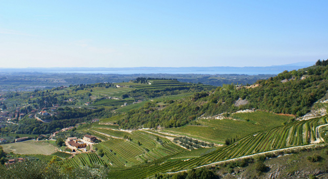 蘇瓦韋產區位于維羅納的東面,是意大利最著名的白葡萄酒產區,于1968年被列為DOC產區。該產區擁有兩種不同的地形:北面的山麓和南面靠近波河的平原。蘇瓦韋的山麓地帶以石灰石和黏土為主,帶有些許火山巖石。葡萄園海拔較高,氣候涼爽,因此葡萄的生長期較長,葡萄在完全成熟的同時還保持高酸度。這里出產的葡萄酒可以標注為“經典蘇瓦韋(Soave Classico)”。而平原地帶的葡萄園以沙土和沖積土為主,儲熱能力較好,加上附近的河流能夠反射陽光,為葡萄園增加熱量,因此葡萄成熟較快,釀出的葡萄酒果味較濃,酸度中等,適合年輕時飲用。
