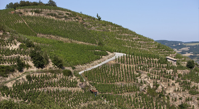 在北羅納河谷葡萄園,河流流經(jīng)之處多為狹窄的峽谷和陡峭的山坡,因此葡萄園也更多地種植在靠近河流的陡坡上。由于離海洋較遠(yuǎn),北羅納河谷葡萄園以大陸性氣候?yàn)橹鳎侄喽嗌偕贂?huì)受到地中海(Mediterranean)氣候的影響,夏季炎熱干燥,冬季寒冷少雨。這里的土壤以礫石、頁(yè)巖和石灰?guī)r為主,排水性能優(yōu)越。這樣一來(lái),種植在山坡上的葡萄藤可以更好地接收生長(zhǎng)季充足的陽(yáng)光,再加上排水性良好的土壤,有助于葡萄果實(shí)更好地成熟。北羅納河谷葡萄園著名的子產(chǎn)區(qū)羅第丘(Cote Rotie)的產(chǎn)區(qū)名在法語(yǔ)中意為“被炙烤的山坡”,就很形象地描繪了這一風(fēng)土特點(diǎn)。