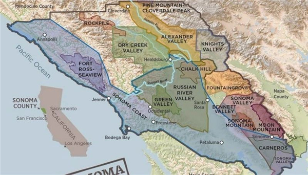 知名的納帕谷AVA旁邊,其實(shí)有一個較鮮為人知但圈內(nèi)人很推崇的大產(chǎn)區(qū),叫索諾馬 (Sonoma) AVA,其緯度、氣候與納帕谷相當(dāng),區(qū)域面積更廣,也更靠近海洋,整體而言更能凸顯風(fēng)土變化,因此更能夠找到適合每一品種的區(qū)域進(jìn)行種植。