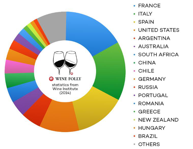 世界三大葡萄酒生產(chǎn)國是法國,意大利,西班牙。這三個(gè)國家?guī)缀跎a(chǎn)了世上一半的葡萄酒,足夠填滿5127個(gè)奧運(yùn)會(huì)大小的游泳池。