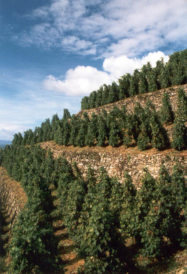高品質(zhì)和獨特的風(fēng)味讓羅第丘葡萄酒受到了熱烈的歡迎,羅第丘的葡萄園數(shù)量在1890年達到了巔峰——朝陽的山坡上,即使是最小的地塊也種植著葡萄樹,呈現(xiàn)出一片欣欣向榮的景象。有些地塊因地勢陡峭,需靠種植者徒步八百米以上運送葡萄,但人們甘之如飴。