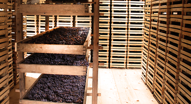 常見(jiàn)的風(fēng)干工藝之一是將果實(shí)留在葡萄藤上進(jìn)行自然風(fēng)干,待葡萄在藤上變干、糖分得到高度濃縮之后再采收,用于釀造甜酒。此種工藝對(duì)天氣條件有特定的要求,葡萄必須在溫暖干燥的秋季才能風(fēng)干,否則會(huì)容易感染灰霉菌。在法國(guó)蘇玳(Sauternes)產(chǎn)區(qū),倘若葡萄沒(méi)有成功感染貴腐菌,一些酒莊便會(huì)采用此方法幫助葡萄濃縮糖分,釀造出風(fēng)味濃郁、口感美妙的甜酒。用這種方式釀造出的葡萄酒有時(shí)會(huì)在酒標(biāo)上標(biāo)注“晚采收(Late Harvest)”。另外,也可將采摘后的葡萄鋪在草席上于室外曬干,又或者把葡萄放置于干燥通風(fēng)的屋子中風(fēng)干〔此風(fēng)干工藝在意大利瓦坡里切拉(Valpolicella)產(chǎn)區(qū)廣泛使用,在當(dāng)?shù)乇环Q作“枯藤法”(Appassimento)〕。風(fēng)干后的葡萄流失了大量水分,果實(shí)中的糖分和風(fēng)味物質(zhì)得以濃縮,因此釀成的葡萄酒擁有飽滿的酒體和較高的酒精度,風(fēng)味也十分濃郁。