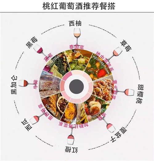 桃紅葡萄酒是“配餐小能手”,幾乎能與所有的菜肴搭配。為方便各位對桃紅葡萄酒和各種菜肴進行搭配,下圖是各種桃紅葡萄酒推薦搭配的菜肴。