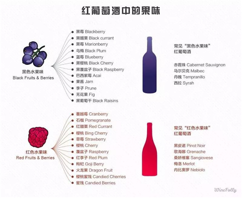①紅葡萄酒中的果味有兩類,紅色水果和黑色水果,這是盲品中判斷葡萄酒風(fēng)格的一大依據(jù);