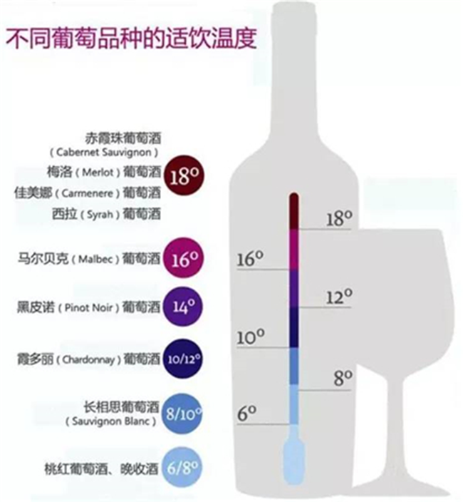 不同種類(lèi)的葡萄酒飲用溫度不同,如起泡酒、白葡萄酒和紅葡萄酒的飲用溫度均不相同。
