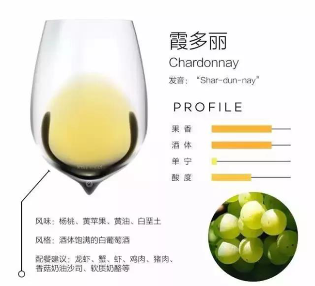 霞多麗是一款源自法國(guó)的干型、飽滿的白葡萄酒。經(jīng)過(guò)橡木桶熟成的霞多麗會(huì)有奶油和黃油的味道。