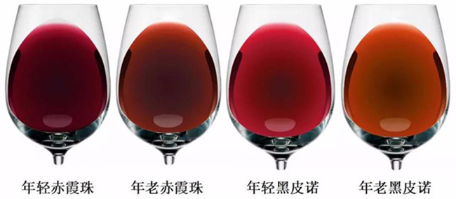 酒體輕盈的紅葡萄酒,如黑皮諾(Pinot Noir)和佳美(Gamay),顏色是從洋紅到石榴紅;酒體中等的紅葡萄酒,如梅洛(Merlot)和桑嬌維塞(Sangiovese),顏色比輕酒體的紅葡萄酒深,有點(diǎn)類似由淺到深的磚紅色;酒體飽滿的紅葡萄酒,如西拉(Syrah)和赤霞珠(Cabernet Sauvignon),顏色深濃,透明度很低。