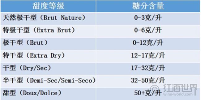 以上的分類方法主要適用于靜止葡萄酒,而起泡酒則根據(jù)糖分含量有單獨的分類方式:
