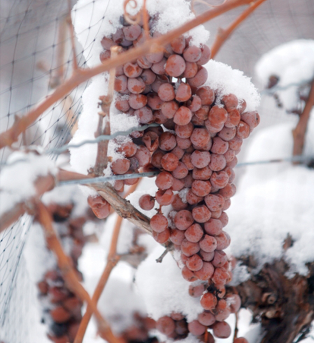風(fēng)干葡萄將“濃縮就是精華”奉為真理,冰葡萄則用冰霜鎖住精華。在寒冷地區(qū),種植者們會(huì)將葡萄留于枝頭,成串結(jié)冰,直至嚴(yán)冬在夜間進(jìn)行采收。冰葡萄硬度大,壓榨時(shí)需要施加較大壓力,榨出來的葡萄原汁僅有正常收獲葡萄的五分之一,卻濃縮了很高的糖分、酸度和風(fēng)味物質(zhì)。最終的成酒沒有風(fēng)干葡萄酒那樣不加掩飾的奔放香氣與厚重酒體,而是以清潤甜美的風(fēng)格自成一派。