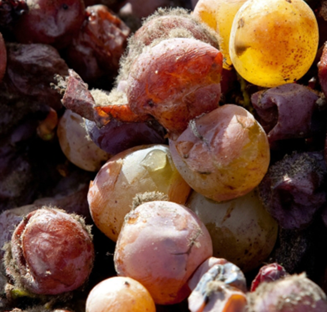 如圖所示,貴腐葡萄身形干癟,表皮還伴有細(xì)細(xì)的菌絲,若對該類葡萄沒有了解,定會(huì)認(rèn)為這是發(fā)了霉的爛葡萄,但到了葡萄農(nóng)這兒,它就是彌足珍貴的釀酒原料。要成為貴腐葡萄,被灰葡萄孢菌(Botrytis Cinerea)侵染是第一步,但灰葡萄孢菌“亦正亦邪”,在適當(dāng)條件下,它可以轉(zhuǎn)化為有益的貴腐菌(Noble Rot),反之則有可能化身為誘導(dǎo)果實(shí)腐爛變質(zhì)的灰腐菌(Grey Rot)。因此,健康果實(shí)感染灰葡萄孢菌的“造化”就全憑清晨是否潮濕多霧、午后是否晴朗干燥來決定了。成功被貴腐菌侵染的葡萄表皮穿孔、水分蒸發(fā),糖分、酸度以及風(fēng)味物質(zhì)高度濃縮,與風(fēng)干葡萄有著異曲同工之妙,卻比風(fēng)干葡萄產(chǎn)量更低、更加難能可貴。