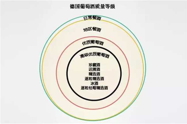 從圖中可以得知,目前德國葡萄酒主要分為 4 個(gè)等級(jí),由低到高分別是:日常餐酒(Deutscher Wein)、地區(qū)餐酒(Landwein)、優(yōu)質(zhì)葡萄酒(Qualitatswein bestimmter Anbaugebiete,簡稱 QbA)和高級(jí)優(yōu)質(zhì)葡萄酒(Qualitaswein mit Pradikat,簡稱 QmP,2007 年更名為 Pradikatswein)。其中高級(jí)優(yōu)質(zhì)葡萄酒下又有 6 個(gè)細(xì)分,分別如下:
