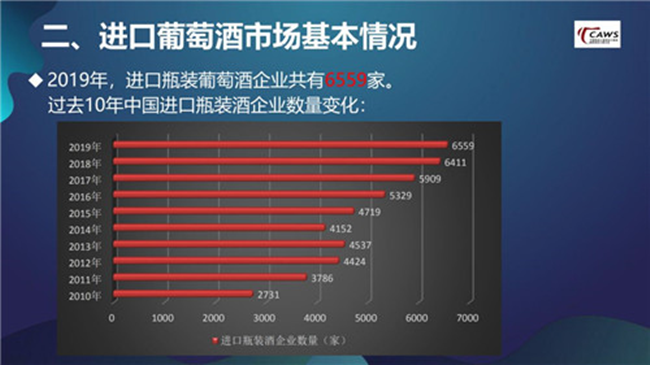進口瓶裝葡萄酒企業數量不斷增加,中小企業面臨挑戰。 從過去10年的數據來看,中國進口瓶裝葡萄酒企業數量整體上是不斷增加的。2019年也不例外,進口瓶裝葡萄酒企業共有6559家,比2018年增加了148家。產生這種情況的原因,我認為有兩個,一是葡萄酒的商品屬性,決定了它經營上的分散化;二是中國葡萄酒企業自身韌性十足,在市場大調整時期仍在堅持。