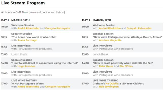在2020 Prowein宣布取消之后,消費(fèi)葡萄酒活動開始轉(zhuǎn)入線上直播。葡萄牙葡萄酒周設(shè)置兩部分,其中包括一對一的B2B會議以及包括訪談、嘉賓演講者等的實時直播。