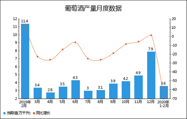根據中國報告大廳對2020年1-2月全國葡萄酒產量進行監測統計顯示:2020年1-2月全國葡萄酒產量為3.6萬千升,累計下降67.6%。