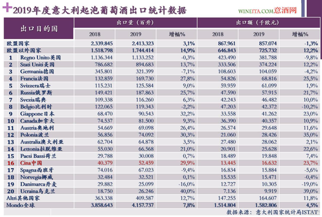 近日,意大利農(nóng)業(yè)和食品市場(chǎng)研究中心(ISMEA)發(fā)布《2019年度意大利起泡酒出口報(bào)告》。根據(jù)意大利國(guó)家統(tǒng)計(jì)局(ISTAT)的統(tǒng)計(jì)數(shù)據(jù),2019年意大利起泡酒出口量超過(guò)415萬(wàn)百升,同比2018年增長(zhǎng)7.8%。出口額為15.828億歐元,同比2018年增長(zhǎng)4.5%。意大利起泡酒出口額的增長(zhǎng)速度高于同時(shí)期意大利葡萄酒的整體出口額增速(3.2%),是意大利葡萄酒出口增長(zhǎng)的有力引擎。