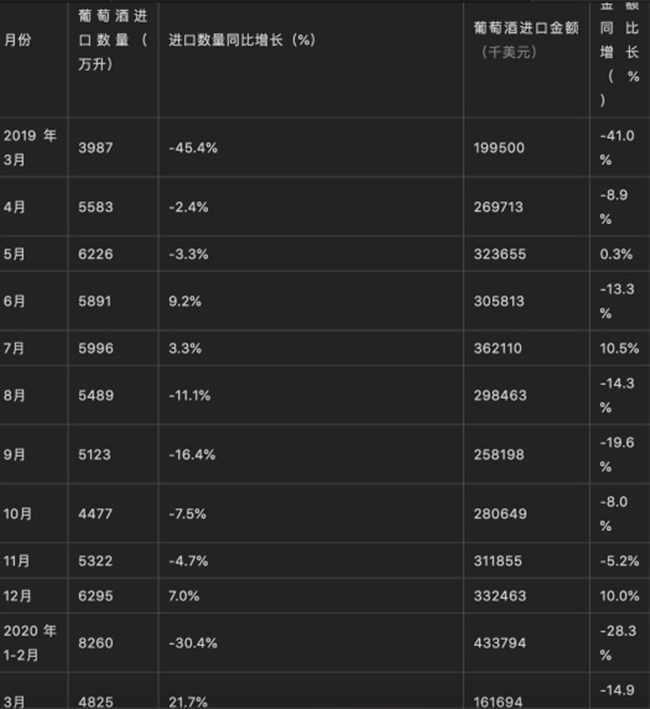 單從2020年3月來看,中國葡萄酒進(jìn)口量為4825萬升,同比增長21.7%;進(jìn)口金額為161694千美元,同比下降14.9%。