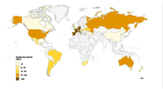 起泡葡萄酒的生產遍布世界各地,然而歐盟的生產集中度最高。事實上,自2000年以來,歐盟一直占據著全球產量的70%-80%。