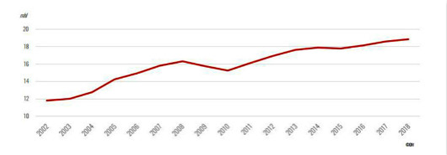 全球起泡葡萄酒消費變化趨勢(2002年-2018年)
