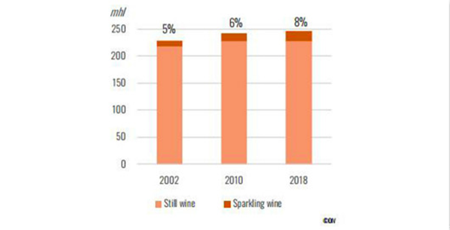 在過去,起泡葡萄酒的國際貿易少于靜止葡萄酒。但從2016年開始,這一趨勢發生了逆轉。2018年,起泡葡萄酒所占貿易份額為48%,而靜止酒為43%。