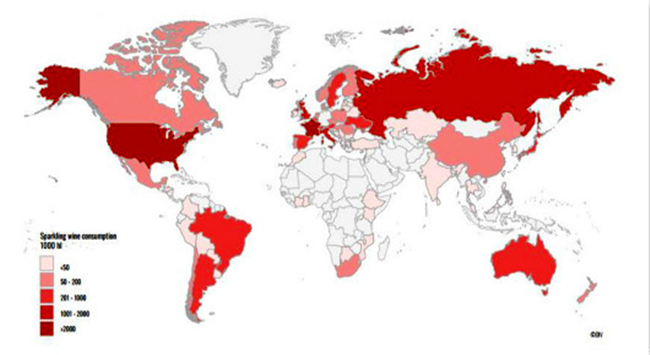全球主要起泡酒出口市場:意大利(3.9億升)、法國(1.9億升)、西班牙(1.8億升)、其它國家(1.3億升)。
