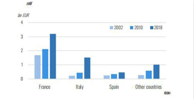 2018年,意大利起泡酒的出口量為3.9億升,占全球起泡酒出口市場的43%。主要出口市場為英國、美國、德國。出口值為15億歐元。