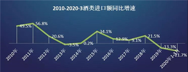 過(guò)去十年,每年的酒類(lèi)進(jìn)口總額除了2013年這一年有微幅下降以外,其他的年份總體都屬于增長(zhǎng)的狀態(tài)。但2019年卻有了一個(gè)明顯的下降。而2020年,受疫情影響,前三個(gè)月甚至出現(xiàn)了負(fù)增長(zhǎng),幅度為21.7%。就此來(lái)看,2020年形勢(shì)不容樂(lè)觀。
