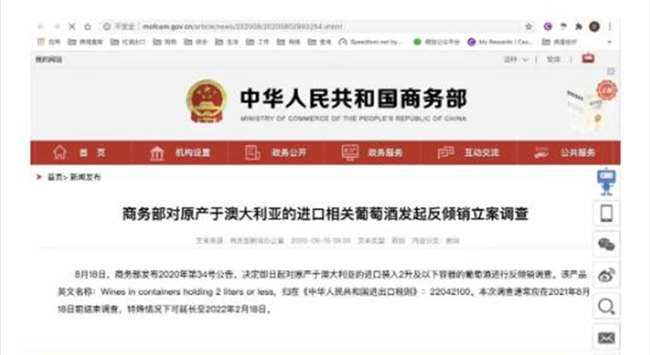 首先是中國(guó)對(duì)澳大利亞葡萄酒展開(kāi)為期幾個(gè)月的反傾銷(xiāo)調(diào)查,一旦傾銷(xiāo)被認(rèn)證,中國(guó)可能對(duì)澳大利亞葡萄酒加征懲罰性關(guān)稅,關(guān)稅可能為商品價(jià)格的202.7%。