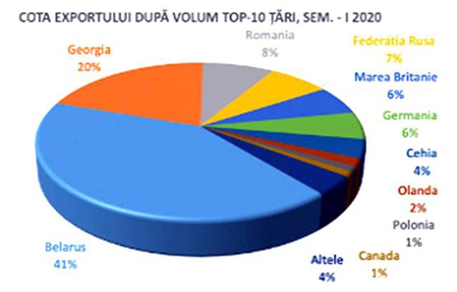 摩爾多瓦向56個國家和地區(qū)的出口總額為12.478億列伊, 比2019年前6個月下降了5.7%(即減少了7470萬列伊)。