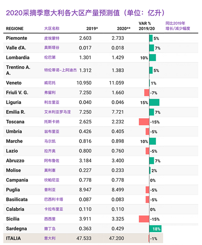 從意大利國內各大區(qū)的葡萄酒產量來看,今年意大利北部的葡萄酒產量同比2019年略增加了3%,中部和南部則分別減少了2%和7%。