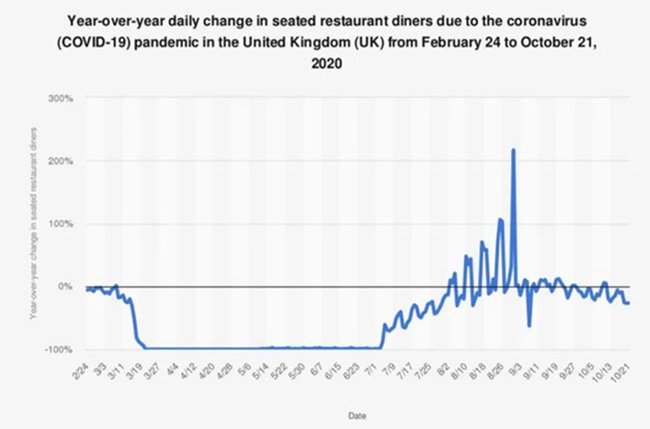 截止2020年10月21日,英國餐廳就餐者的比例比去年下降了26.54%。