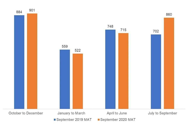 在截至2020年9月的12個(gè)月中,出口額的增長(zhǎng)主要受到了英國(guó)和中國(guó)大陸的良好出口表現(xiàn)的推動(dòng)。尤其在這12個(gè)月中的最后一個(gè)季度,這種漲勢(shì)尤為強(qiáng)勁。
