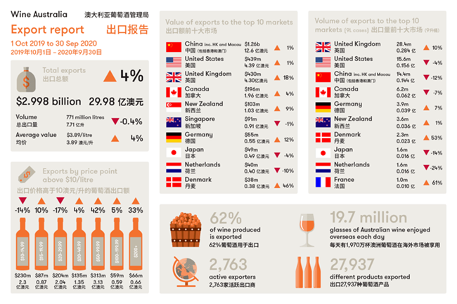 根據(jù)澳大利亞葡萄酒管理局在10月28日發(fā)布的最新出口報(bào)告顯示,澳大利亞葡萄酒的全球需求保持穩(wěn)定,五大目的地市場(chǎng)的出口總額增長(zhǎng)了4%至29.98億澳元。