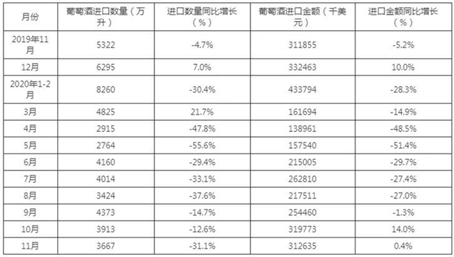 • 2020年1-11月中國葡萄酒進口數量、進口金額及進口均價統計