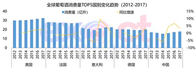 報告顯示,從2015年開始,中國葡萄酒消費量持續(xù)增加,且增速保持在3.5%-6.8%。2017年,中國葡萄酒消費量增加了0.6億升,全球占比7%,相比其他國家市場空間更大。