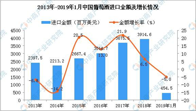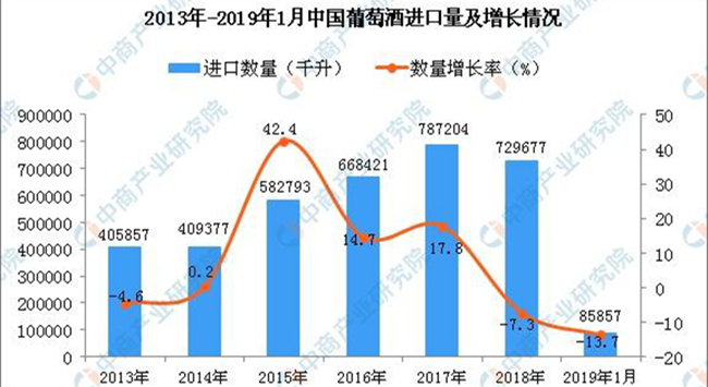 • 2019年1月中國葡萄酒進口量同比下降13.7%