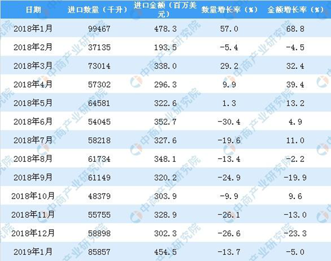 從金額方面來看,2013年-2014年中國葡萄酒進口金額有小幅度下降,2015年-2018年中國葡萄酒進口金額增長;2019年1月中國葡萄酒進口金額為454.5百萬美元,同比下降5%。