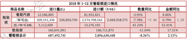2018 年,葡萄酒進(jìn)口量雖出現(xiàn)了自 2014 年來(lái)的首次下行數(shù)據(jù),但跌幅較小,且進(jìn)口額依然實(shí)現(xiàn)了微幅增長(zhǎng),達(dá)到 28.6 億美元,約占酒類進(jìn)口總額的 49.5%,位列進(jìn)口酒類第一位。其中: