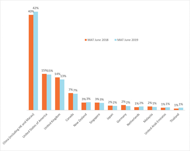 澳大利亞葡萄酒在中國表現非常良好。回顧2019年的前5個月,澳大利亞在進口額上成為中國大陸排名第一的葡萄酒進口來源國。同時,在全球葡萄酒進口市場總量下挫22%的情況下,澳大利亞葡萄酒在中國大陸的表現依然強勢,其市場份額相比于2015年增長了13%,達到了進口總量的24%。澳大利亞鞏固了其作為中國市場優質葡萄酒主要供應商的顯赫地位。
