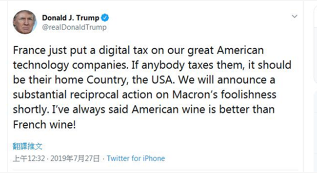 作為對法國近期宣布對全球科技巨頭征收數(shù)字服務(wù)稅的回應(yīng),據(jù)美國《紐約時報》報道,特朗普26日先是在推特上表示,“法國剛剛對我們偉大的美國科技公司征收一項(xiàng)數(shù)字稅,如果說有人要向他們征稅,那也應(yīng)該是他們的祖國——美國。”