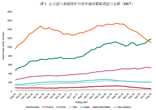 圖1.七大進(jìn)口來(lái)源國(guó)在中國(guó)市場(chǎng)的葡萄酒進(jìn)口總額 (MAT)