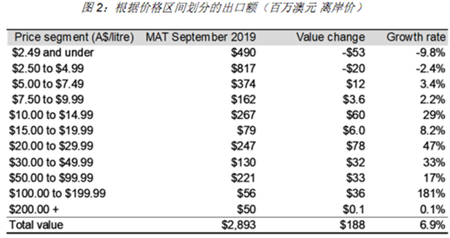 截至2019 年9 月底的12個(gè)月中,澳大利亞葡萄酒對(duì)中國(guó)市場(chǎng) (包括香港和澳門)的出口額持續(xù)增長(zhǎng)18%,創(chuàng)下12.5 億澳元新高,平均出口額上漲了40%至8.42 澳元/升(離岸價(jià))。