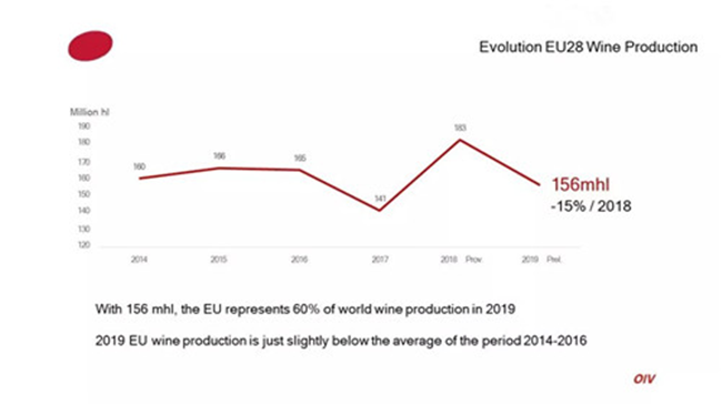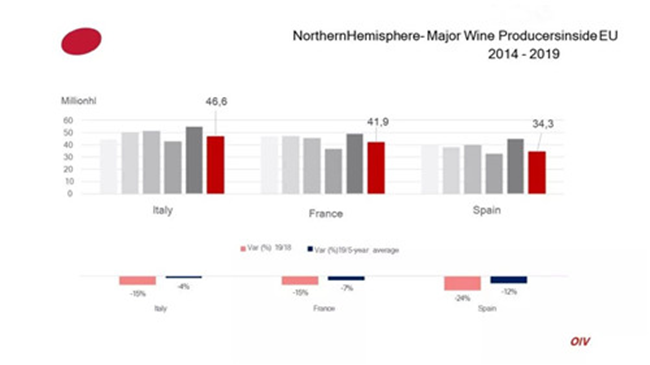 OIV工作人員對媒體表示,2019年全球葡萄酒減產(chǎn)的主因是“氣候災(zāi)害”。很多產(chǎn)區(qū)經(jīng)歷了寒冷多雨的春天與極度炎熱干燥的夏天,葡萄產(chǎn)量減少。
