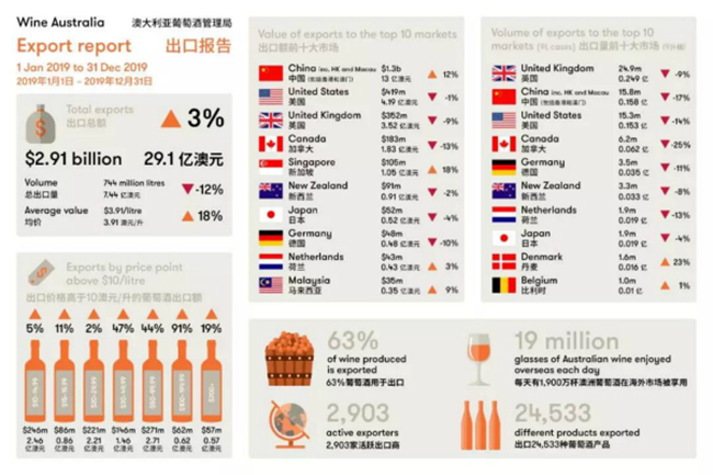 澳大利亞葡萄酒協會(Wine Australia)今天上午發布的數據顯示,在截至2019年12月的12個月里,澳大利亞葡萄酒出口總額增長了3%,達到29.1億美元。