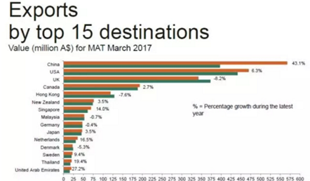 • 澳大利亞葡萄酒 管理局(Wine Australia)于2017年4月發布最新出口報告。報告顯示,在過去一年里,澳大利亞葡萄酒對中國大陸出口持續走強,價量齊升!中國大陸依然保持澳大利亞葡萄酒出口額第一大市場的重要地位。 截止到2017年3月底的一年內,澳大利亞對中國大...
