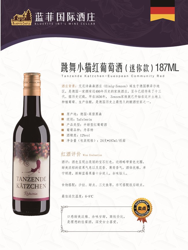 跳舞小貓紅葡萄酒187ml(迷你款),酒色呈現出亮麗的寶石紅色,邊緣略帶紫色光圈;甜美濃郁的漿果氣息以及花香、薄荷香氣;酒體優(yōu)雅,單寧順滑,新鮮藍莓果醬十分迷人,余味怡人。可搭配沙拉、甜點、三文魚等一起食用,亦可搭配飯后甜點。