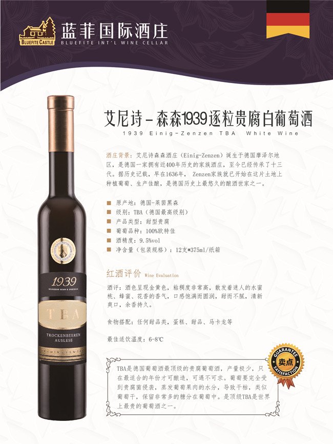 艾尼詩-森森1939逐粒貴腐白葡萄酒的級別是Qmp-TBA(逐粒精選葡萄干),TBA是德國葡萄酒最頂級的貴腐葡萄酒,產量極少,只在最適合的年份才可釀造,可遇不可求。尼詩-森森1939逐粒貴腐白葡萄酒對于葡萄的要求特別高,葡萄要完全受到貴腐菌侵襲,蒸發(fā)葡萄果肉的水分,導致干枯,類似葡萄干,從而保留非常多的糖分在葡萄中。而頂級TBA是世界上最貴的葡萄酒之一。