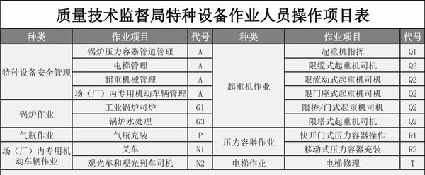 叉車司機(jī)-叉車證N1,電梯維修T,特種安全設(shè)備管理A,起重機(jī)指揮Q1,Q2起重司機(jī)(限門座式起重機(jī)),Q2起重司機(jī)(限橋式起重機(jī)),Q2起重司機(jī)(限門式起重機(jī)),Q2起重司機(jī)(限纜索式起重機(jī)),Q2起重司機(jī)(限塔式起重機(jī))Q2起重司機(jī)(限流動式起重機(jī))Q2起重司機(jī)(限升降機(jī)),觀光和觀光列出司N2,壓力容器壓力管道管理A,電梯管理A,起重機(jī)械管理A,場(廠)內(nèi)專用機(jī)動車輛管理A,工業(yè)鍋爐司爐G1,電站鍋爐司爐G2,鍋爐水處理G3,快開門式壓力容器操作R1,移動式壓力容器充裝R2,氣瓶充裝P,金屬焊接操作-壓力焊PE焊,非金屬焊接操作-壓力容器焊,食品檢驗員,化學(xué)檢驗員,農(nóng)產(chǎn)品檢驗員(4年一審,需要到期前3個月進(jìn)行)從事特殊工種作業(yè)人員必須熟悉相應(yīng)特殊工種作業(yè)的安全知識及防范各種意外事故的技能。要求從業(yè)人員持卡上崗,即由國家安全生產(chǎn)監(jiān)督管理局頒發(fā)《中華人民共和國特種作業(yè)操作證》方可上崗。