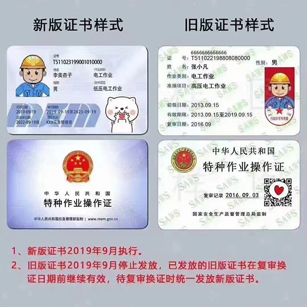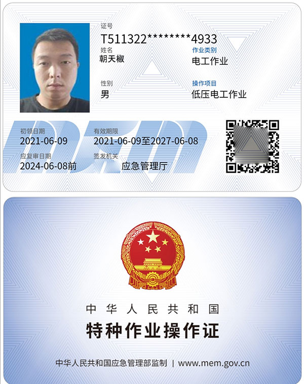 特種作業操作證:作業種類:電工(俗稱 操作證、上崗證)。分類: 高壓操作、低壓操作。