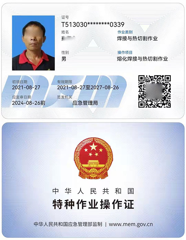 焊工操作證是由國家應急管理部(原安監局)發證,是上崗必備證書,證書帶磁卡,全國通用,有效期為6年,每3年復審一次,滿6年需要重新考核換證。